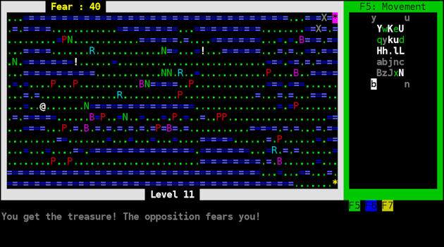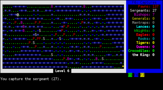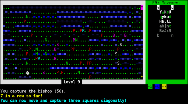 The board is colored with alternating light and dark colors. Helps quite a bit with fighting bishops and making longer diagonal moves in general. There is also SDL mode but it is compiled only for Windows. Linux users need to some nontrivial dependency resolving to compile it first. The looks pass but controls are bit worse. Those of you with disdain for vi-keys will not be pleased. It is here as default control scheme. Sure, you can get around using number pad quite well at the start but later you must make two or three space moves. To do you that need to use the vi equivalent. Despite constantly displaying keys ChessRogue is not good game learn vi style keys because one mistake often means game over. Luckily there is keymap included. On Linux it can be put in home directory or made hidden and it will still be found. Ingame movement display will change to accommodate edits. Unfortunately good news end here. Said keymap states function keys, number pad, return key and other similar key cannot be remapped. Number pad fans are at a loss. People with non-qwerty keyboard layouts will need to edit crkeymap.txt file before playing.